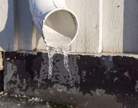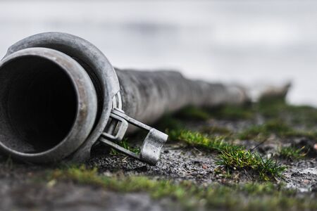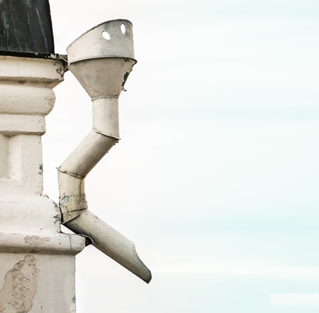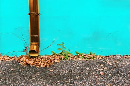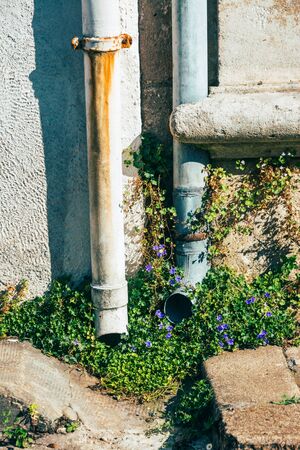 Drainage pipe in the recess of the gutter. Pipe for the water sticking from the ground