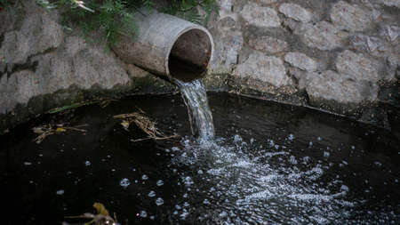 Close-up shot shows water pouring from a rusty metal pipe into a larger body of water. The water appears clear and flowing with visible texture. The lighting suggests an outdoor environment. This image could be used for various environmental, industrial, or conceptual projects.