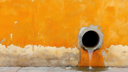 A vibrant orange wall serves as the backdrop for a circular pipe, from which water flows steadily, creating a striking urban scene filled with texture.