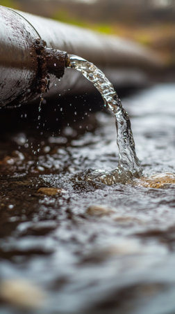 A detailed close-up of water streaming from a rusty sewer pipe, creating ripples in a dark tunnel, highlighting environmental elements and industrial textures.