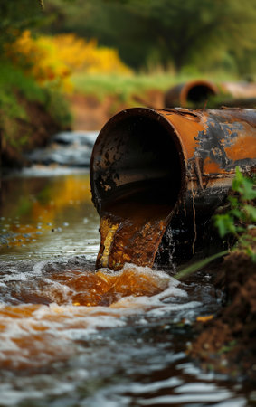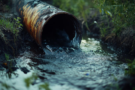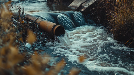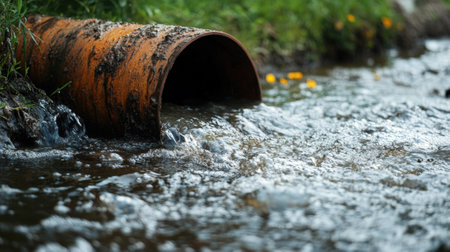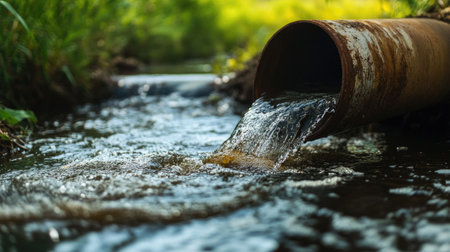 Close-up of waste flowing from industrial pipes into a natural stream, highlighting environmental pollution