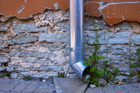 Galvanized metal downspout dreainpipe against an old weathered stone and cracked stucco wall. ideal for urban decay, architecture, and texture backgrounds. Copy space
