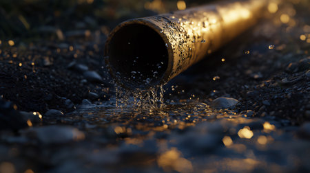 Water is flowing from a rusty pipe, polluting a clean river at sunset