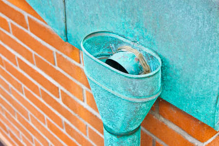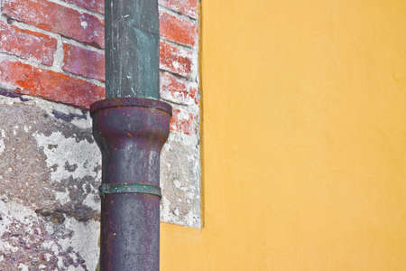 Old rusty copper and cast iron downpipe against a brick and yellow plaster wall - image with copy space.