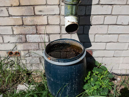 Big, blue plastic water barrel reused for collecting and storing rainwater from roof run-off in urban city environment with brick wall, asphalt and metal gate in the frame