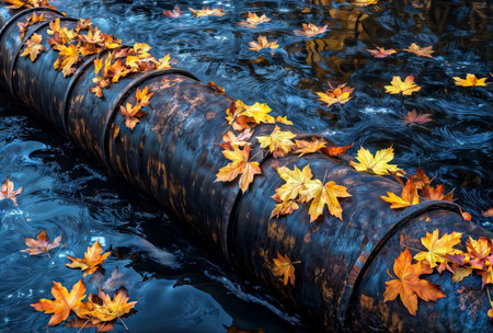 Autumn leaves on metal pipe. Large black pipe with orange and yellow leaves runs diagonally across water in fall scene.