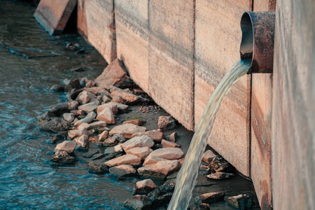 City Polluting the environment. Drainage pipe discharging waist products directly into the river, shot with copy-space