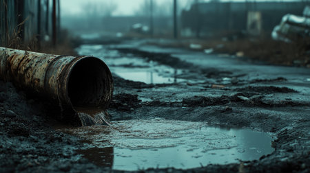 A desolate urban scene captured on a foggy day, showcasing a rusty pipe draining contaminated water into a puddle. The view highlights industrial decay.