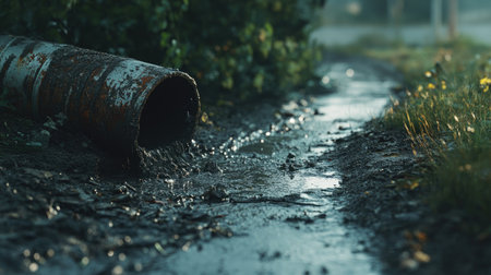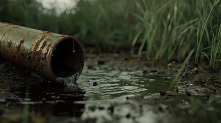 A rusty pipe is seen leaking polluted water into a muddy area surrounded by green grass. The scene depicts environmental contamination and its impact on nature.