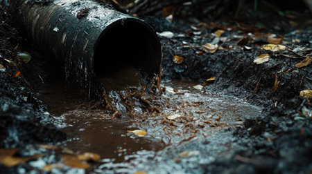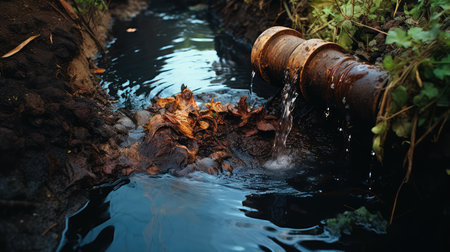 The image captures a pipe discharging muddy water into a natural setting, illustrating the impact of water pollution on the environment with fallen leaves.