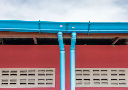 Roofing steel gutter rain system on building corner on light copy space background. Roofing, construction, drainage pipes installation concept.