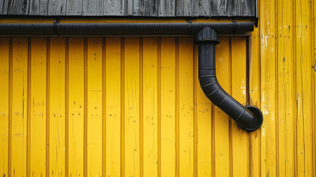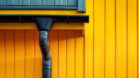 A black pipe attaches to a yellow house, serving as a functional element to drain rainwater from the roof.