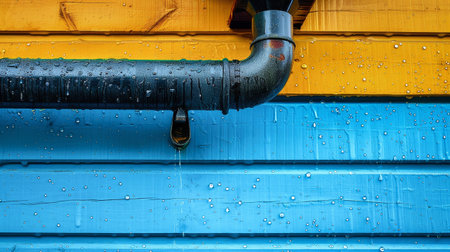 Rainwater drops glisten on a blue and yellow drain pipe attached to a wooden house, adding a touch of beauty to the functional drainage system.