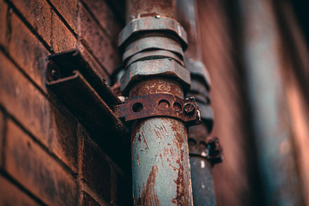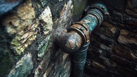 This image showcases a detailed close-up of a weathered rusty pipe against a stone wall, emphasizing the beauty of decay and texture in urban settings.