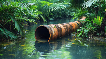 Rusty pipe is discharging wastewater in the middle of a tropical forest