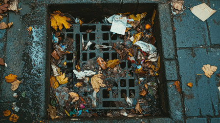 This image captures a city drainage system overwhelmed by leaves and litter, showcasing urban pollution and the need for environmental awareness and maintenance.