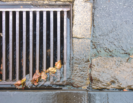 Close-up of an overflowing street drain surrounded by wet leaves and debris, water rushing over the metal grate