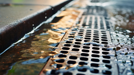 A captivating close-up image of water flowing into a metal grate drain in an industrial setting, showcasing the dynamic movement and texture of the liquid as it cascades over the surface.
