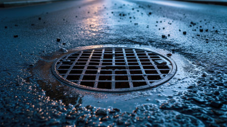 A metal drain cover sits at the center of a puddle on asphalt, reflecting the sky and surrounding environment. Fallen leaves and other natural debris float on the water's surface. The composition uses a low-angle perspective. Ideal for illustrating environmental themes and urban landscape concepts in various applications.