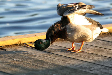 Mallard sunning on the edge of a pond.