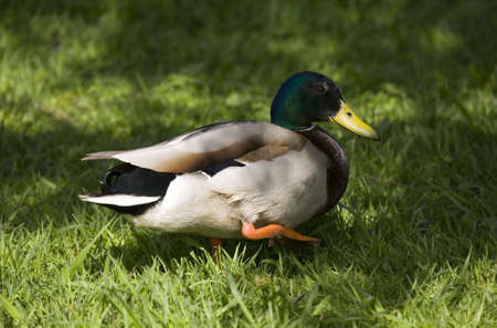 Wild duck on the green grass