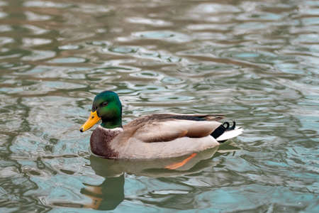 Mallard duck floats on the water surface of the lake