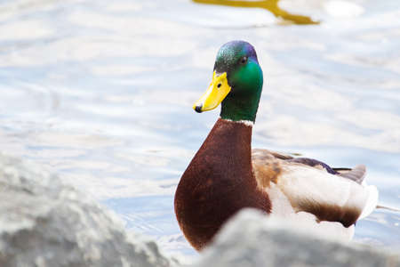 Mallard duck (Anas platyrhynchos). Close up portrait of male wild duck sitting close to the lake, green water with sun reflections on background