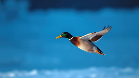 Mallard duck flying gracefully against a serene blue background in winter