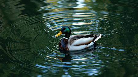 A male mallard duck swimming peacefully in a calm body of water. The ripples on the surface surround the bird, capturing a serene moment in nature and wildlife.