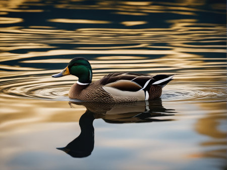 Mallard duck swimming calmly in a serene lake during sunset hours, surrounded by soft golden light and reflections