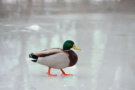 Ducks and drakes walk on snow and on a frozen lake close up
