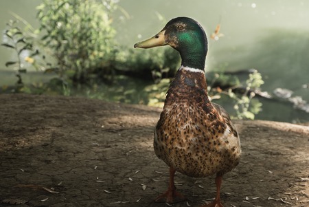 Colorful mallard or wild duck (Anas platyrhynchos) in the rays of the setting sun, against natural environment background. Selective soft focus