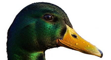 This close-up captures the intricate details of a waterfowl's face, showcasing glossy feathers and glistening droplets. Ideal for nature enthusiasts.