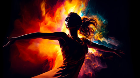 Woman in dress is dancing with colored smoke in the air behind her. Generative AI.