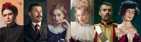 Medieval men and women as a royalty persons in vintage clothing on dark background. Concept of comparison of eras, modernity and renaissance, baroque style.