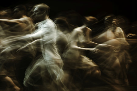 A captivating silhouette of dancers on stage, showcasing their dynamic movements and unity under dramatic lighting effects, expressing energy and artistry.
