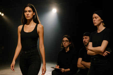 Fashion model walking on catwalk during rehearsal with judges taking notes and evaluating her performance