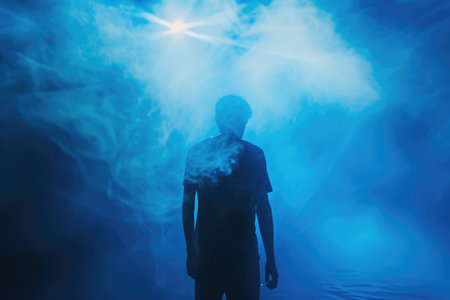 A man sitting in a room with dramatic warm lighting, exhaling smoke in a relaxed yet cinematic atmosphere, his silhouette partially illuminated.