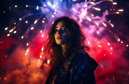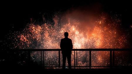 A solitary figure stands watching a vibrant fireworks display. The composition features a silhouette against a backdrop of exploding lights, emphasizing contrast. The scene employs a dark color palette. Potential applications include event promotion, entertainment content, and artistic visuals.