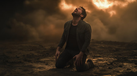 Young man in emotional moment feeling divine presence and connection to faith. Concept Faith, Spiritual Connection, Divine Presence, Emotional Moment, Young Man