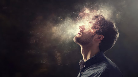 A man stands with his head tilted back as cosmic particles and colors emerge from his head representing imagination and creativity.