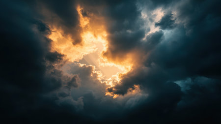 Dark clouds gather as sunlight breaks through, creating a stunning display of color and contrast at twilight, highlighting natures beauty.