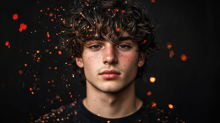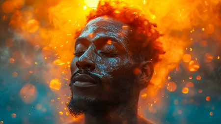 A man's hair bursts into a cascade of tiny particles, radiating outward in a vibrant explosion of energy. The bright, dynamic particles symbolize creativity and transformation, creating a surreal and striking visual impact.
