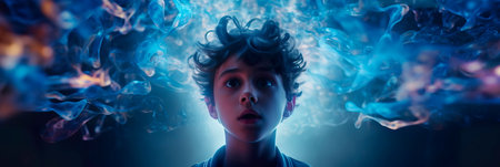 A young man stands with his arms raised, visibly expressing intense emotion as blue electric currents emanate around his head and hands. The environment is dark, enhancing the striking visual of the electricity that surrounds him, creating a dramatic and powerful atmosphere.