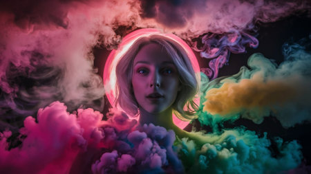 Clouds of colored smoke surrounding a woman. A charming and mysterious atmosphere of an abstract smoky background, captivating you into the cloudy world of erotic fantasies. AI generated.