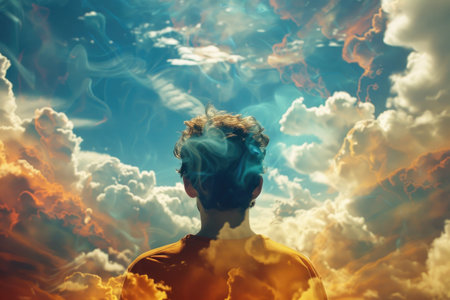 A man stands in contemplation before a vast sky filled with billowing clouds.