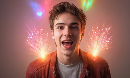 Studio portrait of an enthusiastic young man with fireworks exploding from his shoulders and colorful hearts floating above his head