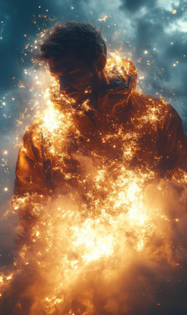 Abstract portrait featuring a face surrounded by fire and smoke elements, creating a dramatic and artistic visual. Ideal for abstract art, fantasy, and expressive themes.