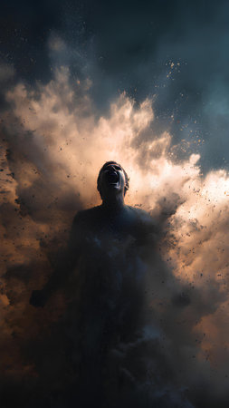 A stunning abstract explosion captured in fiery colors with swirling smoke and particles. This artwork represents energy and chaos, perfect for unique backgrounds and illustrations.