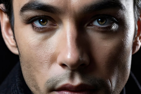 Close-up dramatic portrait of a mysterious man with intense gaze and enigmatic expression, hidden in the shadows, creating a moody and suspenseful thriller scene